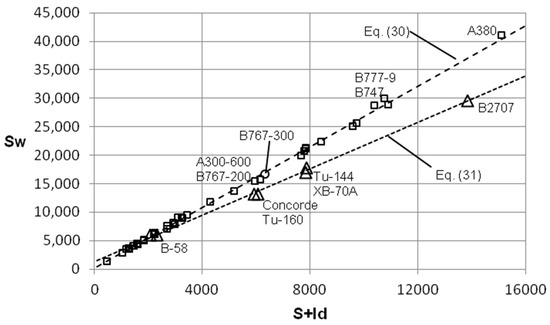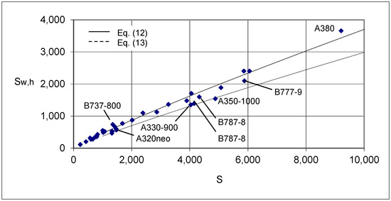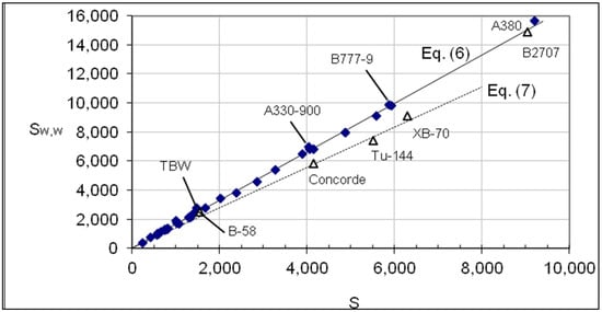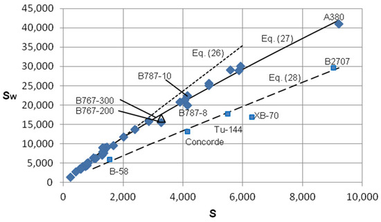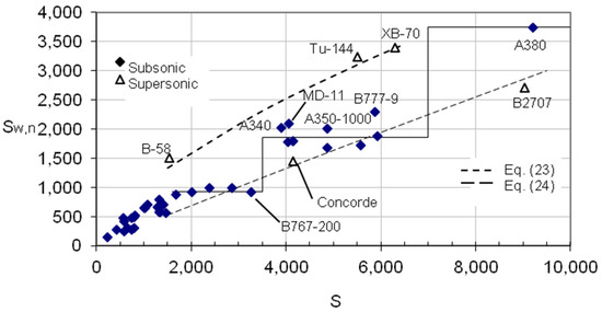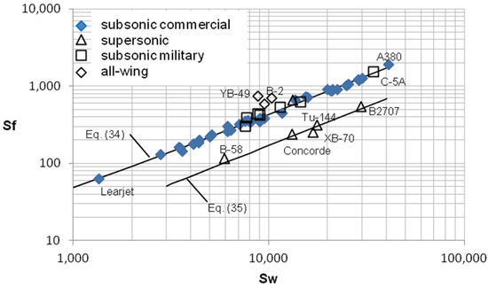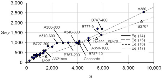 Although the focus here is on the commercial airplanes, it is interesting to note that like the commercial airplanes described by Equation (15), the military airplanes show a similar plateau in Sw,v of about 620 ft2 in the range 1600 ft2 < S < 2500 ft2.