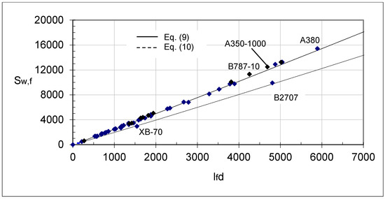 Only two aircraft meet this condition of relatively small nacelle wetted area, and within this small sample the deviation of the data from Equation (24) is ±6%. Airplanes that fall into this category tend to have ducted or podded nacelles that are relatively short compared to the fuselage length, ln/lf < 0.2. Note that the apparent agreement of the nacelle wetted area data for the A350-1000 and the B777-9 with the curve of Equation (24) is purely coincidental.