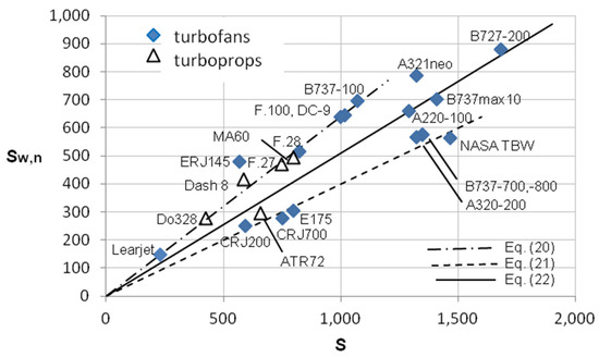 The deviations from Equations (20)–(22) are within ±8% except for the ERJ145, which has an unusually large nacelle wetted area for its wing area, being under-predicted by 23%; the ATR72-500, for which the opposite is true, and is over-predicted by 11%; and the A321neo, under-predicted by 14% for the reasons already discussed.