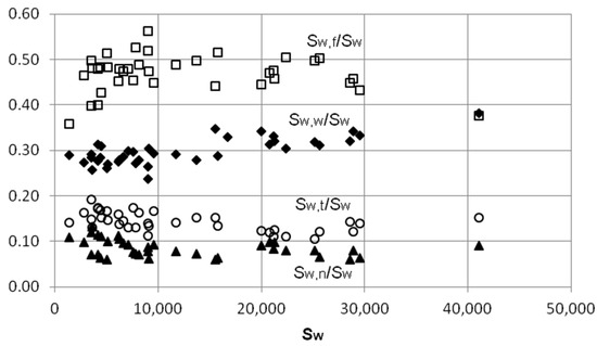 The effective diameter of the nacelle dn is taken as the average of its maximum cross-sectional width and height, as was achieved previously for estimating the effective fuselage diameter. The factor 2/3 in Equation (18) provides reasonable accounting for the wetted area of the pylons carrying the nacelles. Commercial turboprops have a long, essentially constant cross-section, with wing-mounted rather than nacelle-mounted engines, and show relatively high values of Sw,n compared to commercial jets of similar size. The wetted areas of such nacelles are also calculated using Equation (18) but without the 2/3 factor.