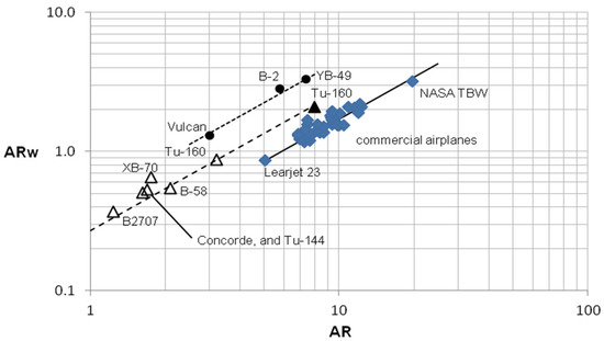 In total, 35 of the 37 commercial airplanes fall within ±4.7% of Equation (6); the 2 remaining airplanes in the commercial group, the Do328 and the NASA Truss-Braced Wing (TBW), are underestimated by 7.8% and 11.8%, respectively. In general, the wing wetted area of the subsonic military airplanes tend to be about 9% larger than commercial airplanes of the same wing planform area.