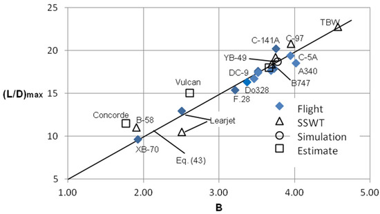 The B-47 and the B737-10, although designed for very different missions, have close similarities in all metrics in Table 5, except for a 19% larger wetted area for the B737-10. Therefore, under the same flight condtions cD,0 and (L/D)max should be comparable.