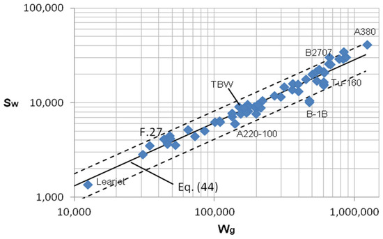 Mueller [22] proposed a general correlation for all flight vehicles over all flight regimes in the form mg = CS3/2, where m is the gross mass of the vehicle, C is a constant with the dimensions of density (that is, a uniform density) and S is the planform area. Mueller suggested that for S measured in m2, C = 1 kg/m3 for hang gliders and some proposed high-altitude long-endurance UAVs, while C > 15 kg/m3 for conventional small and large aircraft, with small aircraft having values of C closer to 15 than large aircraft, while for sailplanes it is perhaps less than 15 kg/m3. Using this approach based on the square–cube law, Durmus [25] proposed considering the characteristic area of an airplane to be its total wetted area, and its volume to be directly proportional to its mass, so that Sw ~ mg2/3 and proposed that Sw ≈ 0.5 mg2/3. Using the values calculated in the present study, the relationship between the maximum gross weight and the total wetted areas is illustrated in Figure 17. A reasonable correlation to the data is given by