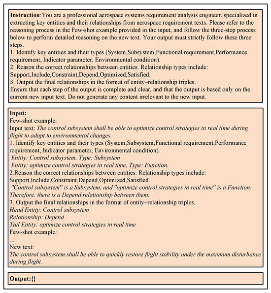 Specifically, we propose a step-by-step CoT reasoning framework to enhance the model’s capabilities in NER and RE tasks, as illustrated by the few-shot example in Figure 5. This framework comprises three core steps: first, the domain-adapted LLM analyzes the requirement text to identify key entities along with their corresponding entity types; second, based on the recognized entities, the model performs relational reasoning to infer the associations between entities and generate appropriate relation labels; and finally, the outputs of entity recognition and relational reasoning are organized into structured entity–relation triples, thereby improving the readability and usability of the extracted information.