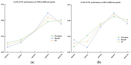 NER and RE performance in different epoch. (a) Description of LLM-ACNC performance on NER in different epochs; (b) description of LLM-ACNC performance on RE in different epochs.