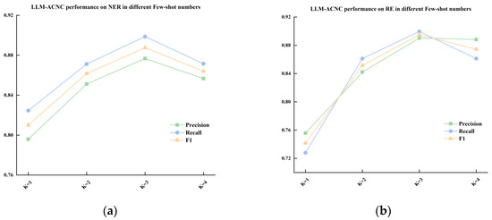 Model performance with different few-shot numbers. (a) Description of LLM-ACNC performance on NER with different few-shot numbers; (b) description of LLM-ACNC performance on RE with different few-shot numbers.