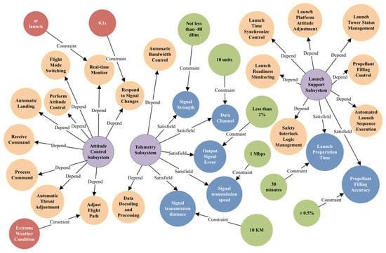 Among the identified entity types, subsystem entities constituted the largest proportion, followed by function-type entities, encompassing functions such as Real-time control, Data decoding, and Status monitoring. With respect to relationship types, dependency relationships were the most prevalent, reflecting a high degree of functional coordination between subsystems and their associated functions. For instance, the Telemetry system is closely linked to multiple functional entities and is constrained by various performance indicators, including Communication range, Data rate, and Response time. Moreover, it depends on support from other subsystems—such as the Attitude control subsystem, Propulsion system, and Ground control center—to facilitate flight status data acquisition and coordinated system control. Figure 9 displays a segment of the constructed KG, illustrating several requirement-related entities associated with the Telemetry subsystem. This figure highlights the hierarchical structure and semantic relationships among entities, thereby laying a solid foundation for subsequent graph-based reasoning and system-level design.