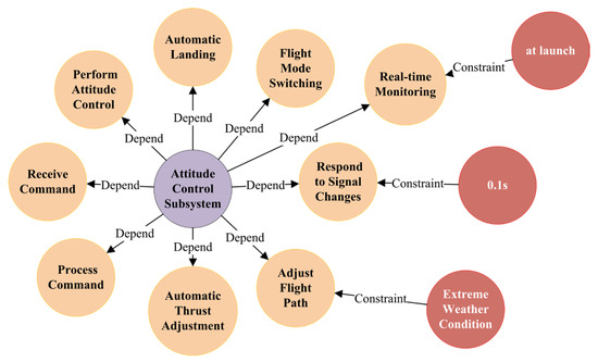 By identifying and constructing a KG from unstructured requirement texts, the textual knowledge embedded in aerospace requirements can be transformed into a graph-structured format for effective representation and management. Figure 10 illustrates a subset of requirement entities and their corresponding relationships associated with the attitude control subsystem. Based on this, we designed a standardized aerospace system requirement items template based on the standard terminology in requirements engineering [48,49], as shown in Table 7. Building on this foundation, a plug-in based on a template-matching strategy was developed. This plug-in automatically selects and populates templates based on the extracted entities and their relationships. Specifically, it first identifies the relation type of the given triple in order to determine the corresponding semantic template. Subsequently, the names and types of the involved entities are extracted, and the most appropriate sentence template is matched from a predefined library, according to the combination of relation type and entity types. Finally, the entity names are dynamically inserted into designated placeholders within the selected template, thereby generating a complete and structured system requirement items, as illustrated in Figure 11.
