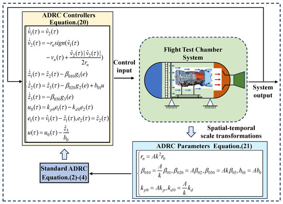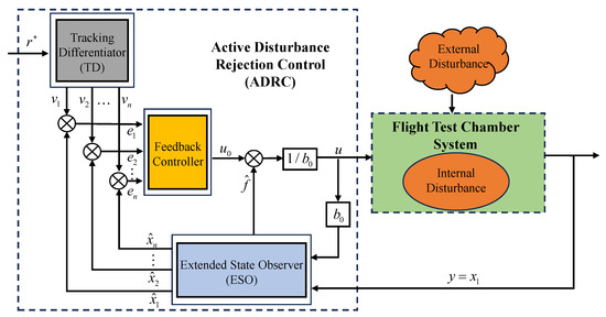 In this section, spatial–temporal scale transformations are applied to the TD, ESO and feedback controller. Further, a novel parameter tuning rule for ADRC is obtained. The control parameters to be adjusted for TD, ESO and feedback controller in the ADRC control of the flight test chamber system are shown in Figure 2.