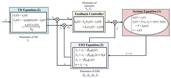 where the control component can be obtained using various mature feedback controllers. For example, in a linear ADRC method, a proportional–derivative (PD) controller is selected as the feedback controller; then, one has = . The parameters and are the gains of proportional and derivative control, respectively.