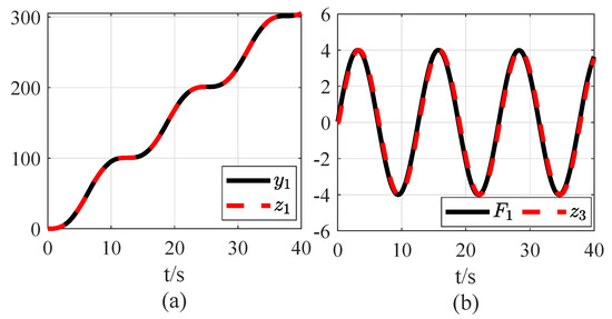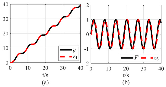 The simulation environment is consistently implemented in Matlab, with the system sampling period s and the total simulation time s. In addition, the total disturbance F of the original system (1) is set as , , , and there is no known input. As an example of parameter tuning for the linear ESO, the observation error function is selected as . The system states and total disturbance estimation capabilities of ESO are further investigated. By the trial-and-error method, the bandwidth of the observer is given as . Therefore, based on the bandwidth configuration method, the gains of ESO are selected as . When the total disturbances F change to , the new parameters of ESO, based on the obtained parameter tuning relationship, are given as , , .