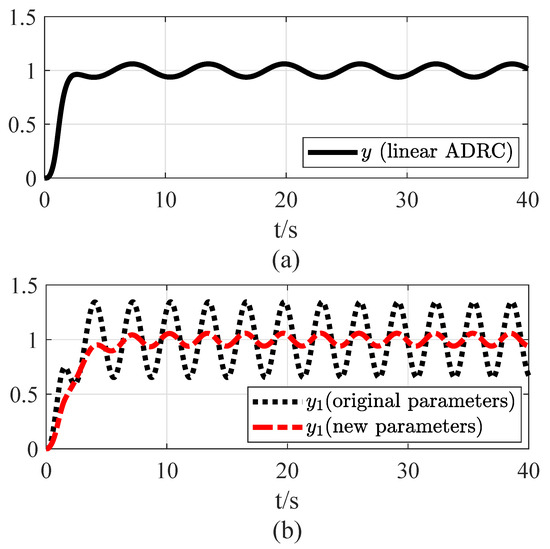 For the overall ADRC parameter tuning, a linear ADRC is employed to validate the efficacy of the proposed parameter tuning rule. The program environment used above remains unchanged. The original system (1) is set as , , . The input is u and the reference value is = 1. According to the trial-and-error method, a set of linear ADRC parameters are obtained as follows: , , , . The simulation results of the original system under the linear ADRC method are shown in Figure 8a. When the original system is modified to , , . By (21), the new parameters are obtained as , , , .