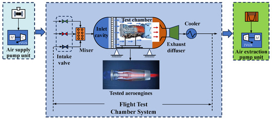 The flight test chamber system, serving as a critical control component for establishing aeroengine flight conditions, comprises several essential elements including the intake valve, mixer, test chamber, exhaust diffuser, cooler, air supply pump unit and air extraction pump unit, with its structural diagram as shown in Figure 9.