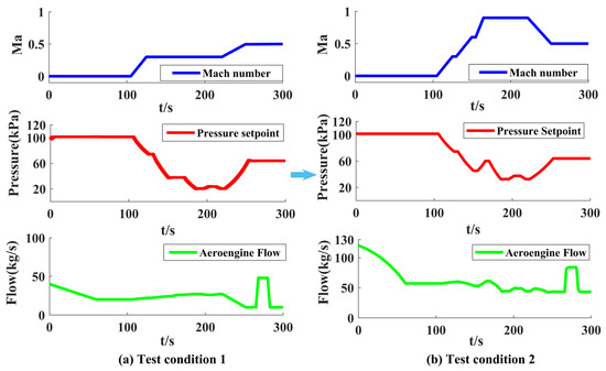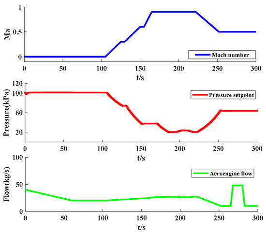 The aeroengine test conditions are changed to accommodate different testing requirements. By adjusting the flight Mach number, pressure setpoint and aeroengine flow, a new test condition (i.e., test condition 2) is established, as depicted in Figure 13. The ADRC parameters of test condition 1 are kept unchanged and directly applied to the intake pressure control of the flight test chamber system under test condition 2. The results of control performance are presented in Figure 14.