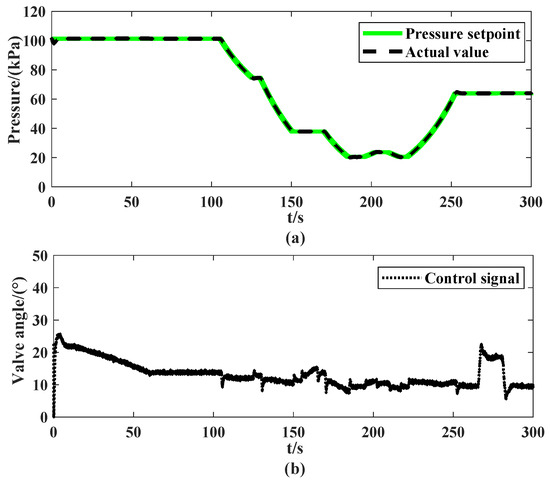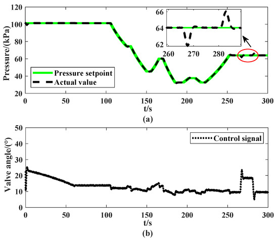Results of the intake pressure control response and control signal: (a) control response; (b) control signal.