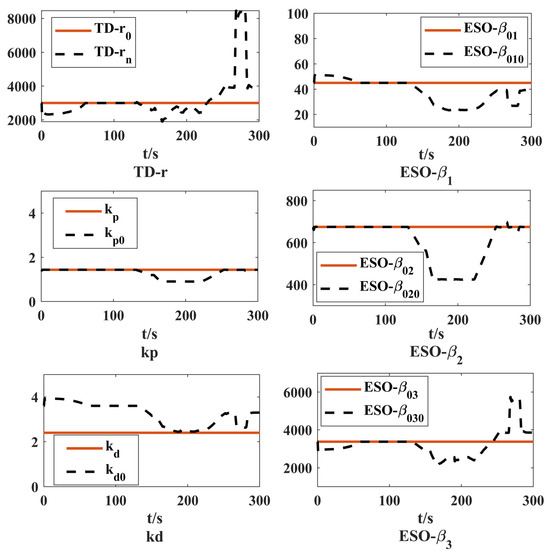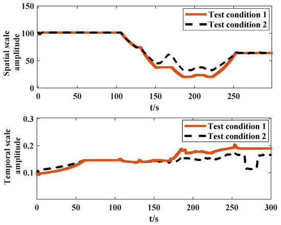 By Equation (1), the total disturbances F of the original system is defined as . When its amplitude and frequency change, the total disturbances become . To obtain the new parameters of ESO, the spatial–temporal scale transformations of the original system and ESO are as follows: