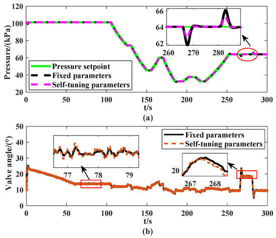 According to this ADRC self-tuning method, the intake pressure control results of the flight test chamber system are shown in Figure 17. As can be seen from Figure 17, when the fixed parameters of ADRC are adopted, the maximum pressure error is 2.0 kPa, while the maximum pressure error with the self-tuning parameters is only 0.9 kPa. Under test condition 2, compared to the performance with fixed ADRC parameters, the tuned parameters obtained by the proposed method effectively reduce fluctuations and convergence time during the fast transient phase (250∼300 s), while maintaining the control signal at a similar level for both parameter sets. The quantitative comparison is summarized in Table 1. Therefore, when the test conditions of the flight test chamber system change, tuning the ADRC parameters using the proposed method can significantly improve control performance.
