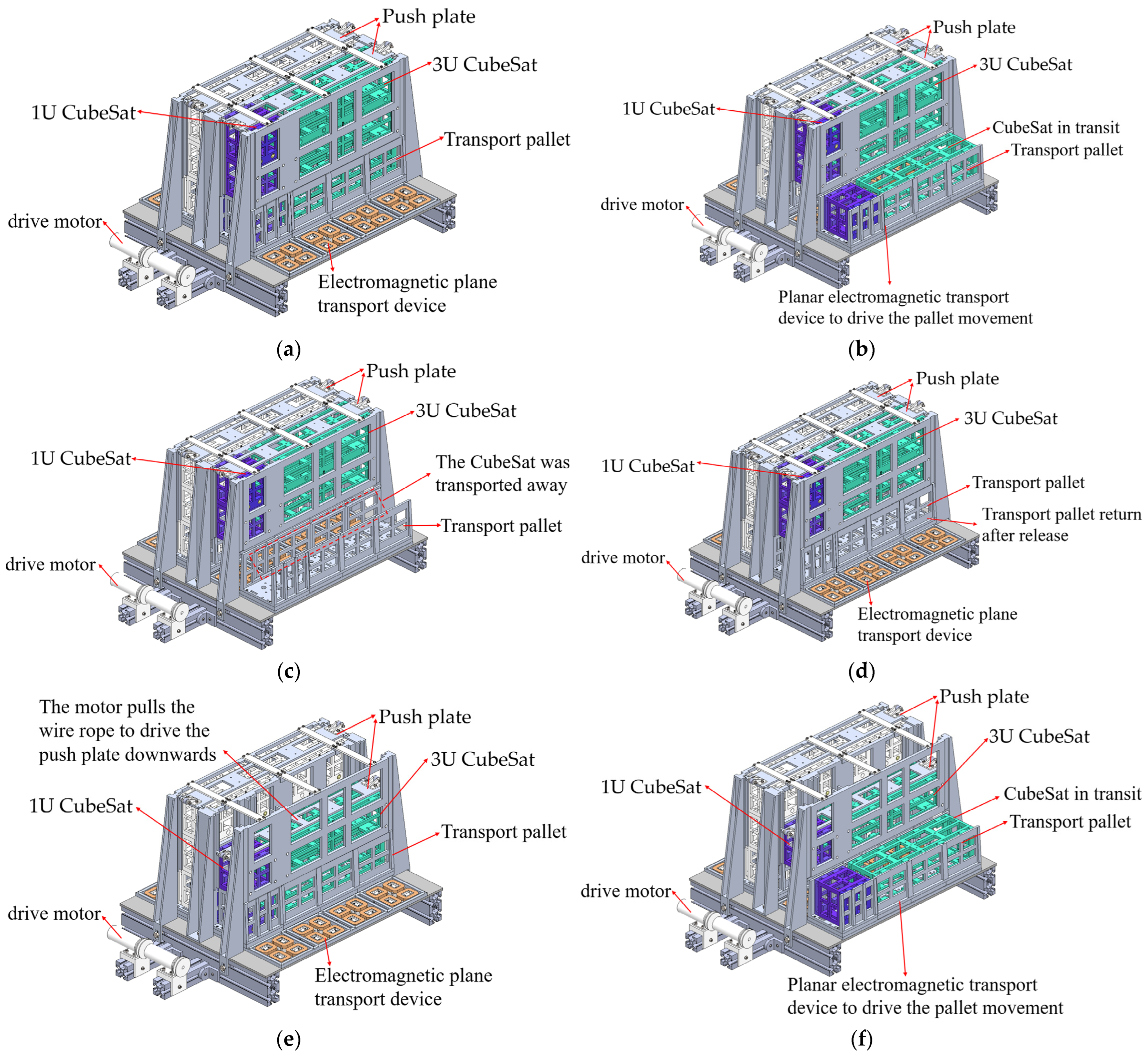 Figure 5 shows a schematic diagram of the CubeSat transit process. Our device was designed with a completely different mindset than a conventional CubeSat deployer. Conventional CubeSat deployers are equipped with individual box bins for each stored CubeSat for storage, ensuring that the release environment of each CubeSat is not interfered with by other CubeSats. Conventional CubeSat deployers are unable to stack CubeSats for storage, reducing space utilization. Instead, our storage device will work with the designed electromagnetic transfer platform and electromagnetic ejection device for release, as shown in Figure 5. The transfer pallet transfers the CubeSats loaded in it to the designated location on the electromagnetic transfer platform. The electromagnetic ejection device releases the CubeSat for launching. After that, the transfer pallet returns to the bottom of the storage device to continue receiving the CubeSats. A wire rope with a pusher plate pushes the whole row of CubeSats downwards until the permanent magnets on the transfer tray attract the patches on the CubeSats. Subsequently, the CubeSat will enter the transfer tray, and at this time the motor will turn off and push the plate to stop moving. The upper layer of the CubeSat is stuck by the wave bead screw on the storage device to achieve passive locking. Repeating the transfer, release, and push actions, the CubeSats can be stacked to achieve non-interference in their separation and release. In the design process, we stacked different kinds of CubeSats for storage, and separated the stacked CubeSats by a motor, a wire rope, and a pusher plate, so that the stacked CubeSats would not affect each other when they were released. Our device utilizes a lower volumetric mass of wire rope, push plates, and wave bead screws for separation, reducing the additional mass. This design, in conjunction with a storage device for stacking and storing CubeSats, effectively improves space utilization while providing great expandability.
