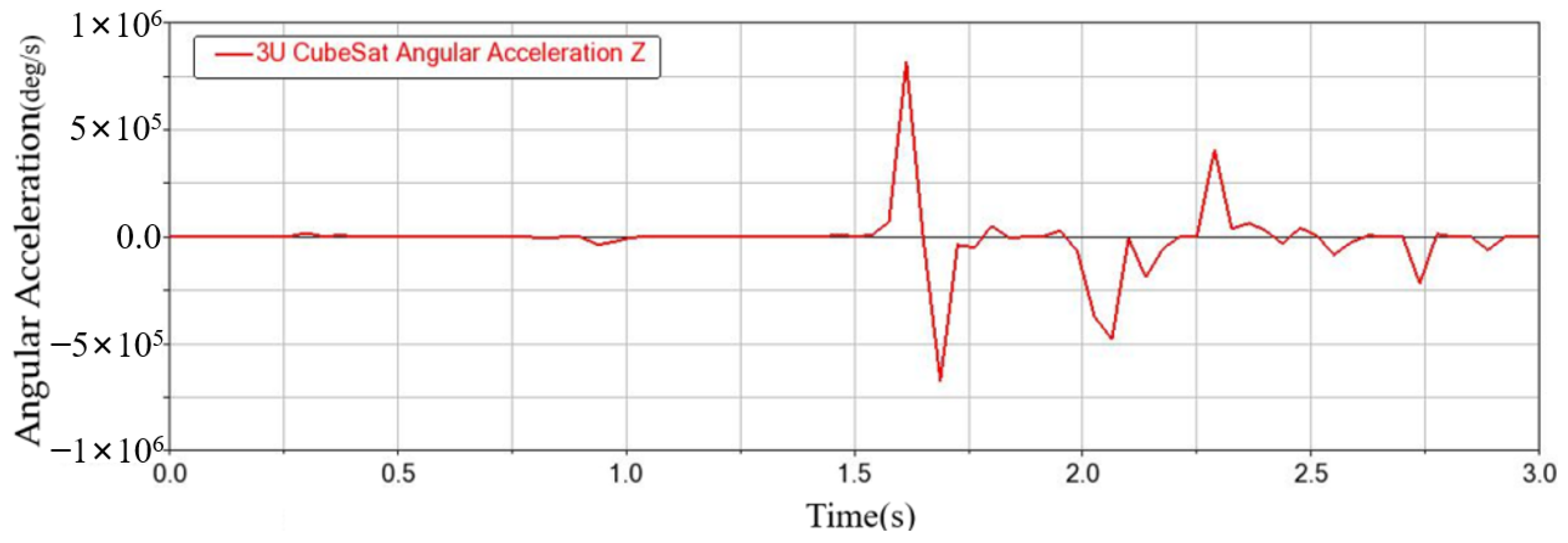 Analysis of a CubeSat’s axial acceleration and angular acceleration is conducted, as shown in Figure 34 and Figure 35. Compared to the motion state of a first-layer CubeSat during deployment, a second-layer CubeSat exhibits slightly larger angular velocity fluctuations. The angular velocity and angular acceleration exhibit notable changes as the CubeSat approaches its final position, with the maximum absolute angular velocity being less than 25 degrees per second. Consequently, the CubeSat’s motion process is slightly less stable than that of the first layer, but overall remains relatively stable.