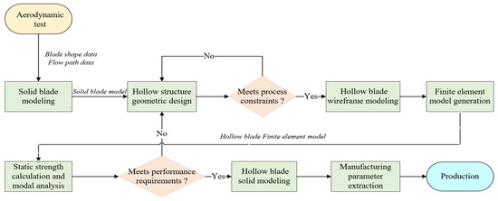 The performance of an engine fan depends on the blade structure, so it is necessary to continuously optimize the geometric structure of blades. At present, the design process of iterative trial and error is mainly adopted. As shown in Figure 2, for a specific type of hollow blade, the steps of geometric structure design, CAE finite element model generation, static strength calculation, and modal analysis in the process usually require several iterations. Among them, the geometric structure design of the hollow blade is the foundation for structural optimization. Only by building a hollow blade model based on the design parameters can its structure be optimized and iteratively calculated, and finally the design result that meets the performance requirements can be obtained. In addition, the geometric structure design result not only needs to meet the performance requirements of subsequent CAE analysis but also needs to meet the constraints of the manufacturing process. For example, its diffusion bonding strength is directly related to the wall plate thickness, core plate thickness, and its connection angle (corrugation angle) [6].