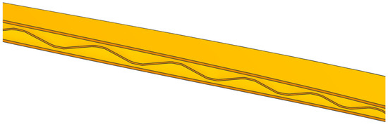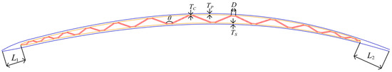 is the spanwise length of the transition part. When , that is, at the blade cavity tip boundary, the proportional position ; when , that is, at the bottom boundary of the transition part, the proportional position . In order to ensure that the core plate gradually transforms into a bonding wall plate from the cavity tip in the transition part, the inward offset distance of the transition corrugation is , that is, when the design cross-section is located at the blade cavity tip boundary, it is completely offset to the center of the inner cavity, and the core plate is a smooth plate, while at the bottom boundary of the transition part, no offset is performed, and the core plate forms a completely twisted corrugated structure. Figure 16 and Figure 17 show the offset process and structural shape of the transition part corrugation.