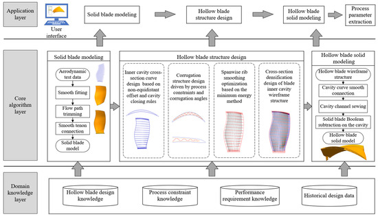 This paper combines hollow fan blade design knowledge, manufacturing process constraints, and geometric algorithms to propose an intelligent parametric design solution and system development method for the geometric structure of the three-layer hollow fan blade. The system solution and architecture are shown in Figure 5, which consists of the application layer, core algorithm layer, and domain knowledge layer.