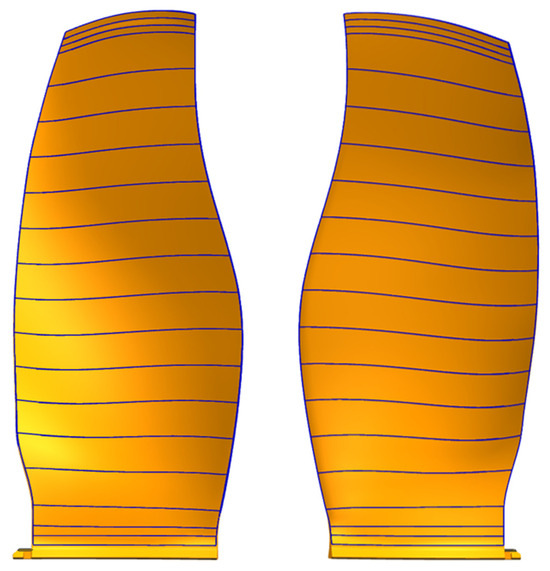The blade outer pressure and suction side surfaces are first cut based on the design height of the solid part of the blade tip and root. The corresponding sampling on the cut pressure and suction side surfaces obtains the point series, and the midpoints of the corresponding connection lines are fitted to obtain the mid-surface. The mid-surface UV parameter directions are controlled to be spanwise and chordwise. The isoparametric curves are constructed along the spanwise direction, and their spanwise positions are the design cross-section positions. The isoparametric curves are projected onto the outer surfaces on both sides along the blade thickness direction to obtain the outer cross-section curves, as shown in Figure 6.