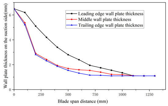 The design parameters of the inner cavity cross-section curves include the length of the solid parts at the leading and trailing edges and the thickness of the pressure and suction wall plates, as well as the cavity closing rule parameters. In order to improve the performance of the hollow fan blade, these design parameters are all variable parameters, among which the length of the solid part of the leading and trailing edges varies along the span direction, and the thickness of the pressure and suction wall plates varies along both the span and the chord direction. For example, the suction wall plate thickness distribution of a certain model of blade is shown in Figure 7.
