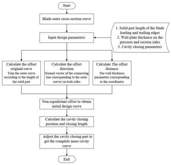 In addition, the higher requirements for wall thickness reduction in the hollow fan blade also bring challenges to the cavity closing design of the hollow structure. If the cavity closing length is too long, a narrow cavity gap will be generated, which will cause micro-motion wear during application. Therefore, for a thin-walled hollow blade, the cavity boundary needs to rapidly increase the wall thickness to complete the cavity closing. In response to the variable wall thickness and rapid cavity closing design requirements of the hollow fan blade, this paper proposes a cavity cross-section curve design method that combines a three-dimensional curve non-equidistant offset and cavity closing design. The specific process is shown in Figure 8.