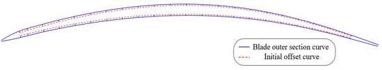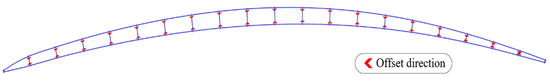 The base curve, offset direction, and offset distance are first determined based on the design parameters: The base curve is the outer shape curve of the cavity part, which is obtained by cutting the outer shape cross-section curve according to the solid part length of the leading and trailing edges. The offset direction is determined by the corresponding relationship between the base curves of the pressure and suction side, that is, the vector direction of the line connecting the corresponding points between the two curves is the offset direction at that location, as shown in Figure 9. The offset distance is determined based on the wall plate thickness design parameter. Since this parameter changes along both the span and chord directions, the offset distance at each point is obtained through position interpolation. This paper adopts a non-equidistant offset method based on sampling fitting to obtain the initial design of the inner cavity curves. The sampling density is determined by the design accuracy, and the outer shape curves of the pressure and suction sides are offset according to the above-mentioned offset directions and offset distances, as shown in Figure 10. However, since the given wall plate thickness variation parameters are difficult to accurately express the shape of the cavity closing parts and narrow the cavity width to the core plate thickness, the initial inner cavity curves cannot meet the shape characteristics of the wall plate thickness rapidly increasing in the cavity closing parts.