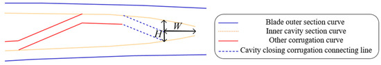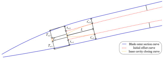 Therefore, this paper proposes a cavity closing design method for the inner cavity curves of the hollow blade, as shown in Figure 11. The inner cavity boundary is narrowed to the core plate thickness , while keeping the pressure and suction wall plate thickness ratio unchanged, that is Equation (1).