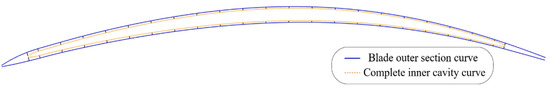 Based on the cavity closing judgment rules, the starting positions of the cavity closing part can be determined. The initial offset curves can be smoothly extended from this position to the cavity boundary points at the leading and trailing edges, and finally the complete inner cavity curves are obtained, as shown in Figure 12.