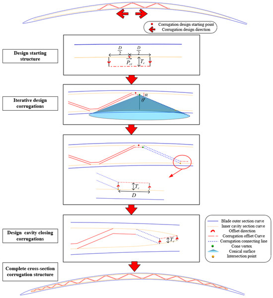 - An innovative parameter design method for the corrugation structure in the cross-section is proposed, which is the key geometric algorithm for the design of hollow blade core plates. By constructing the conical surface with the design angle, corrugations in the designed cross-section one by one are automatically generated, and the rapid parametric design of the corrugated core plate structure is achieved.