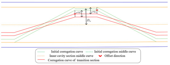 The design method of cavity closing corrugations is as follows: the conical surface is first constructed according to the end point of the previous corrugation, normal direction at that position and specified angle. The starting point of cavity closing corrugation is obtained by the intersection point with the inner cavity cross-section curve on the other side. The inner cavity curve between this point and the boundary point is intercepted and offset inward to obtain the bonding part of the cavity closing corrugation. The adjacent corrugations are connected to obtain the complete cross-section corrugation structure, as shown in Figure 13.