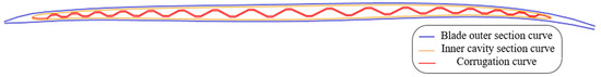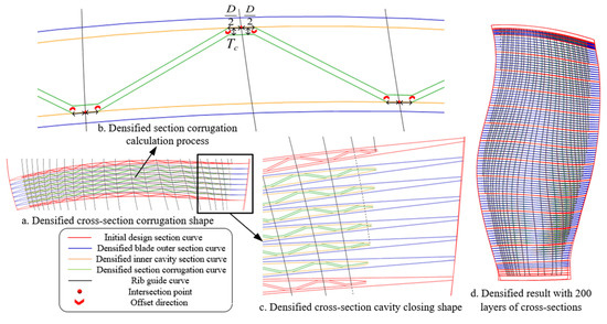 The position of the added cross-sections is obtained by linear interpolation between the spanwise coordinates of the initial design cross-sections, and the interpolated coordinates are projected along the blade thickness direction to the pressure and suction outer surfaces to obtain the outer curves of the added cross-sections. The outer curves of the densified cross-sections are offset according to the inner cavity cross-section curve design method in Section 4.1 to obtain the inner cavity cross-section curves of the densified cross-sections. The corrugations in the densified cross-sections are designed based on the spanwise smoothing rib guide curves. This paper proposes a spanwise smooth corrugation structure densification method, as shown in Figure 19.