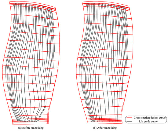 This optimization problem is concise and clear, and the gradient descent method is used to minimize . In this paper, the smoothing coefficient is 0.8 and the angle change coefficient is 0.2. The optimization process terminates when either of the following criteria is met: the relative change in the energy function between consecutive iterations is less than , or the Euclidean norm of the gradient is below . Additionally, a maximum of 20,000 iterations is set to ensure termination in case the convergence criteria are not strictly satisfied. The computational complexity of each iteration is , where is the number of corrugations. The shape of the spanwise guide curves after smoothing obtained through iterative calculation is shown in Figure 18b, in which the guide curve kinking is eliminated, the curvature changes evenly, the corrugation angles meet the requirements, and the result meets the performance and process constraints in the structural design.