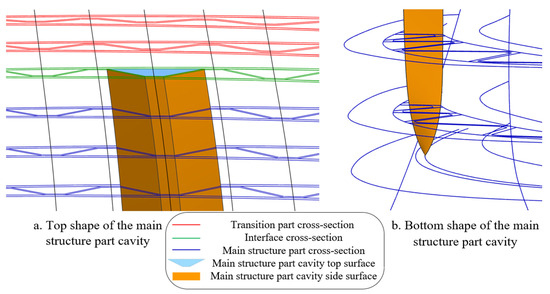 After the above-mentioned inner cavity cross-section curve design, cross-section corrugation structure design, rib smoothing optimization, and cross-section densification process, the densified cross-section wireframe structure model of the smooth hollow blade is obtained, as shown in Figure 19d. Although the wireframe structure model can be directly related to the design parameters, which brings convenience to the design and optimization adjustment, and can also quickly realize the finite element meshing, it lacks structural integrity and cannot completely replace the solid model. Therefore, it is still necessary to create a solid model based on the hollow blade wireframe structure model. Since the outer surfaces of the hollow blade remain consistent with the original solid blade, only the hollow structure is added inside; thus, this paper models the hollow blade by subtracting the cavity part from the solid blade, which reduces the modeling process of the outer surfaces and improves efficiency. The hollow blade solid modeling method proposed in this paper is as follows: According to the structural characteristics of the hollow blade, the cavity area is divided into two parts along the span direction, the main structural part and the transition part, and the cavity channel entities are constructed separately. The core plate of the main structure part is diffusely bonded to support the wall plate, and its cavity geometric characteristic is that each cavity channel is not connected to other channels and exists independently. So, it is necessary to perform separate solid modeling on each cavity channel, as shown in Figure 20.