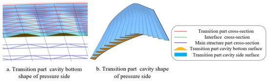 The air intake transition part is located at a distance below the blade tip. Its corrugation structure does not fit the wall plate, and its corrugated cavities are connected to each other. Therefore, it is necessary to construct two cavity solid models on the pressure side and the suction side, respectively. The modeling process is shown in Figure 21. Its bottom surfaces are obtained by constructing bounded surfaces in the interface between the transition part and the main structure part. The two side surfaces are, respectively, the wall plate inner cavity surface and the corrugated cavity surface. The wall plate inner cavity surface is generated by smoothly connecting the inner cavity cross-section curves. The corrugated cavity surface is composed of multiple connected surfaces and is generated by connecting the corresponding characteristic curves of each corrugation smoothly. The top is a closed shape of the side surfaces, and the bottom surfaces and side surfaces are sewn to obtain the transition part cavity entities.