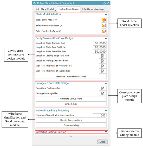 Based on the aforementioned intelligent design process and method of the three-layer hollow fan blade, this paper researched and developed an intelligent design system for the three-layer hollow fan blade. The system uses the C/C++ programming language for secondary development based on the Siemens NX11.0 geometry platform, in the Visual Studio 2019 development environment. By calling design knowledge and design parameters and combining interface functions, the intelligent design of the hollow blade is realized. The system’s main interface is shown in Figure 23.