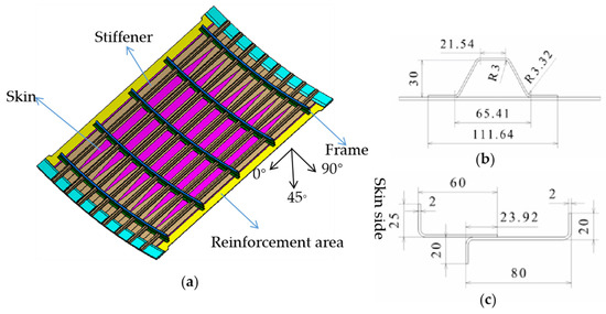 (a) Fuselage panel specimen. (b) Cross-section of the hat stiffener. (c) Cross-section of the frames.