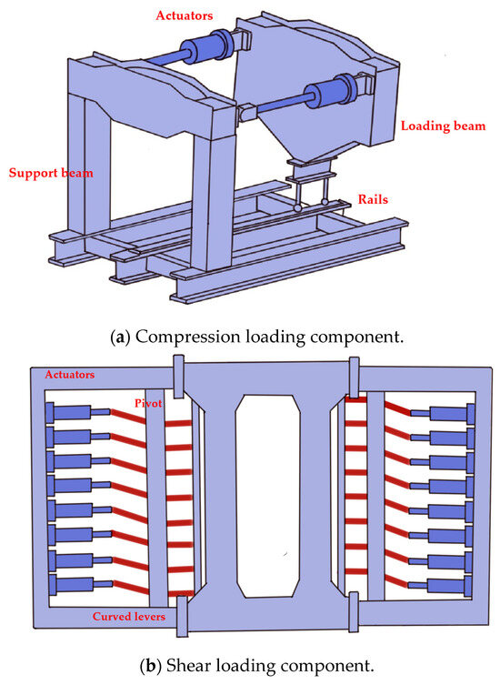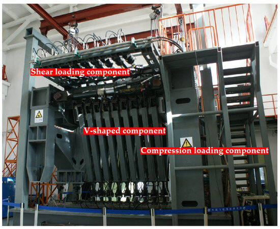 Figure 2 illustrates the Fuselage Panel Test System (FPTS, developed by Aircraft Strength Research Institute of China, Xi’an, China). The testing setup is composed of three main parts: the compression loading component, the shear loading component, and the V-shaped support component, as shown in Figure 3. In this apparatus, axial tensile and compressive loads are applied through two actuators, both connected to a support beam and a loading beam, as illustrated in Figure 3a. When activated, the actuators drive the loading beam along precision linear guide rails, enabling controlled and accurate load application. The curved ends of the test specimen are fastened to the fixtures using mechanical fasteners, simulating fixed boundary conditions, while the straight edges are connected to V-shaped components that provide simple support constraints.