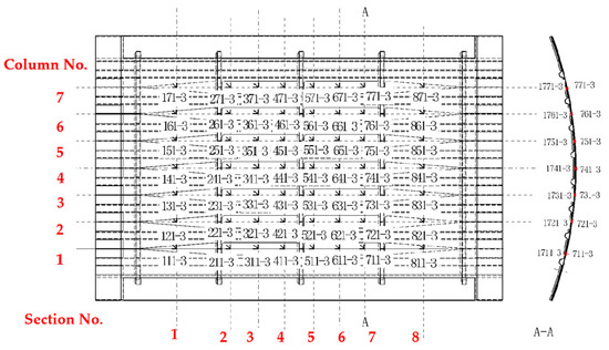 During the test, strain measurements were conducted using strain gauges. Figure 4 and Figure 5 show the locations of the strain gauges. The strain gauges on the skin were installed in a back-to-back configuration. The strain gauge numbering convention on the skin is as follows: