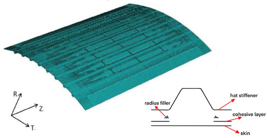 The comprehensive finite element model of the test specimen, depicted in Figure 6, is constructed using a cylindrical coordinate system in ABAQUS/Standard (6.14 version). The skin, stiffeners, and frame are modeled with four-node shell elements (CS4R), while the radius fillets within the hat stiffener are represented using 3D eight-node solid elements (C3D8R). Cohesive elements are incorporated to accurately simulate the interfacial behavior between the skin and stringers. Furthermore, the constraints are applied to enforce proper connectivity between the skin and reinforcement plates, as well as between the frame and stiffeners, ensuring a realistic representation of the structural interactions.