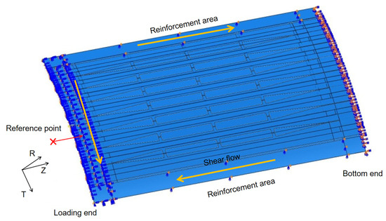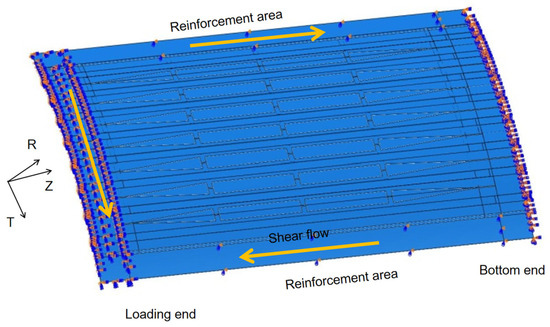 Under pure shear loading conditions, the rotational and translational degrees of freedom (DOF) for all four edges are illustrated in Figure 8 and detailed in Table 5. The shear load is applied to the entire specimen through shear flow, exerted on three edges, while the bottom end remains fixed.