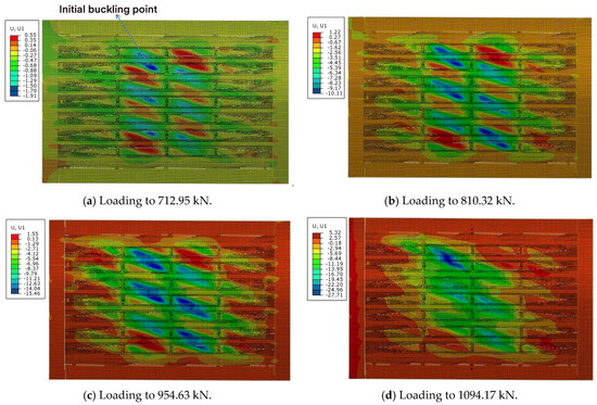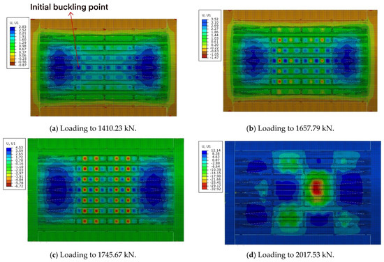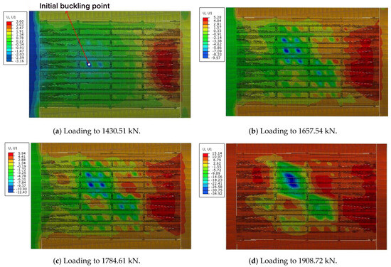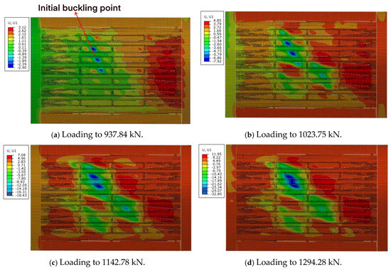 The displacement of R−direction in post-buckling progression of test specimen under compressive load. (a) Initial buckling at 1410.23 kN. (b) Loading to 1657.79 kN. (c) Loading to 1745.67 kN. (d) Loading to 2017.53 kN.