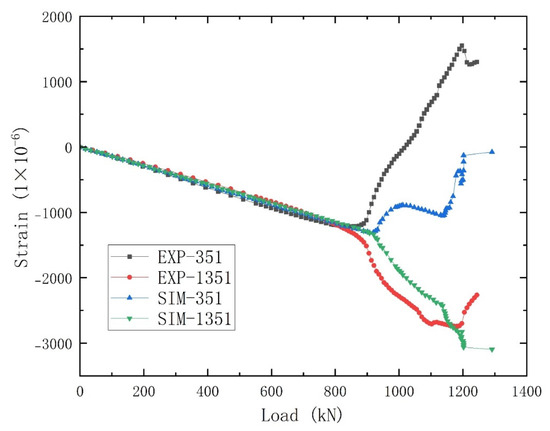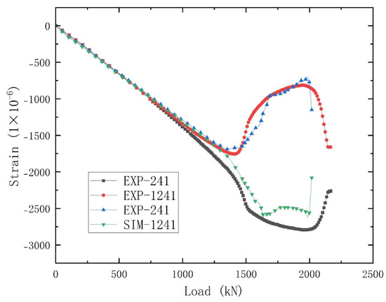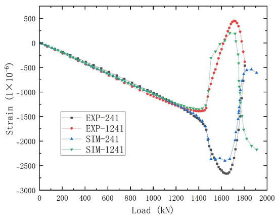 Load−strain curve of simulation and experiment for initial buckling point (No. 241) under compressive load.
