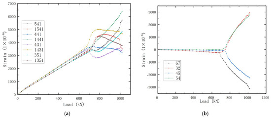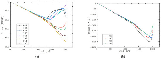 Typical load−strain curves of experiment for skin and stiffeners in central area. (a) Load-strain curves obtained from the skin. (b) Load-strain curves obtained from the stiffeners.