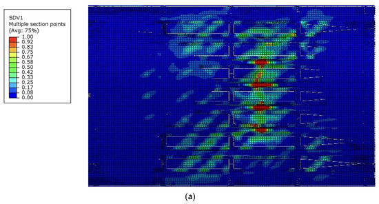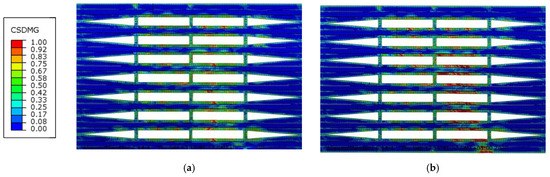 In this study, Hashin’s failure criterion, incorporating stiffness matrix degradation, was employed to accurately simulate the failure behavior of both the stiffener and the skin. This criterion comprehensively accounts for tensile and compressive damage modes in both the fiber and matrix phases, providing a robust framework for predicting progressive failure in composite structures [28].