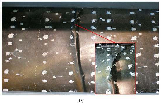 As illustrated in Figure 29, the final failure mode of the fuselage panel exhibited fracture of the stiffeners and skin along an oblique angle, with the failure angle being smaller than that observed under combined load case A.