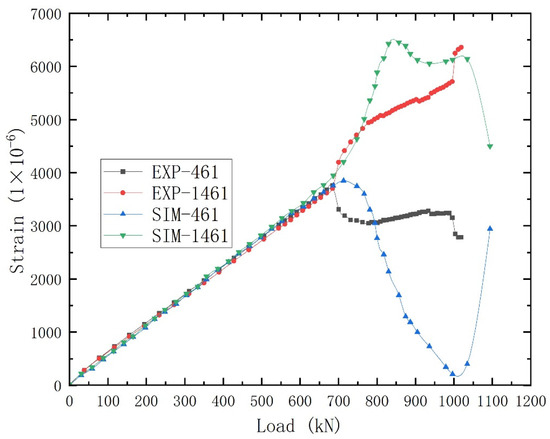 Load−strain curve of simulation and experiment for initial buckling point (No. 461) under pure shear load case.